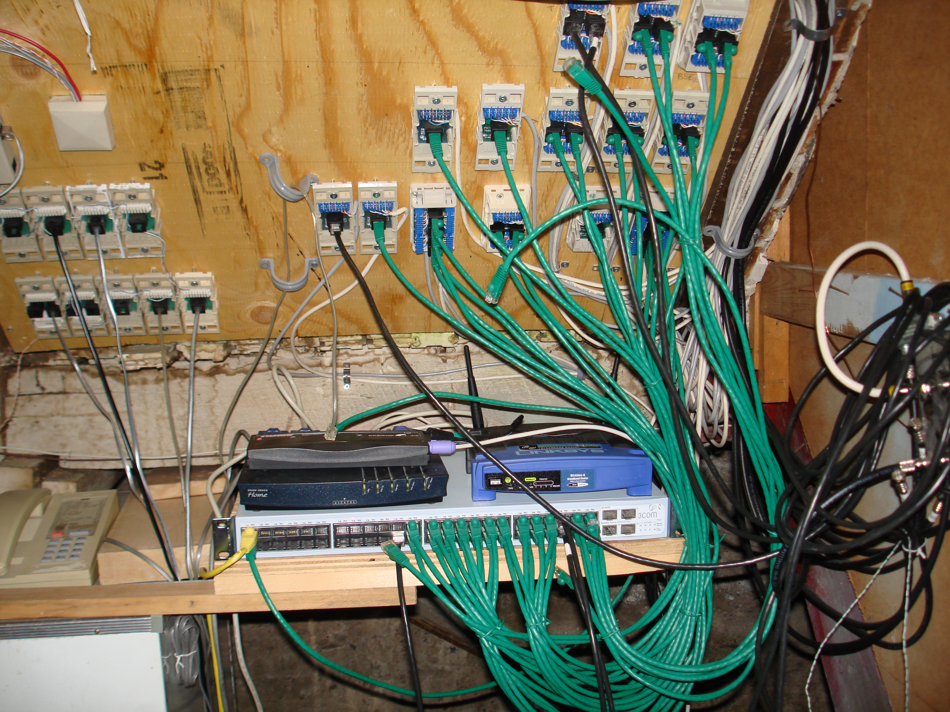 After rewiring our home on the electrical side of things we knew that we should take advantage of the holes in the house to also run network wiring. While this was rather a large pain in the posterior we wanted to be able to push all kinds of content throughout the house and wireless just wasn't up to the job (think recorded television shows, music, webcams, VoIP and whatever else the future might bring). So we set about wiring the house with Cat5e (for data and voice) and Coax (for television signals).