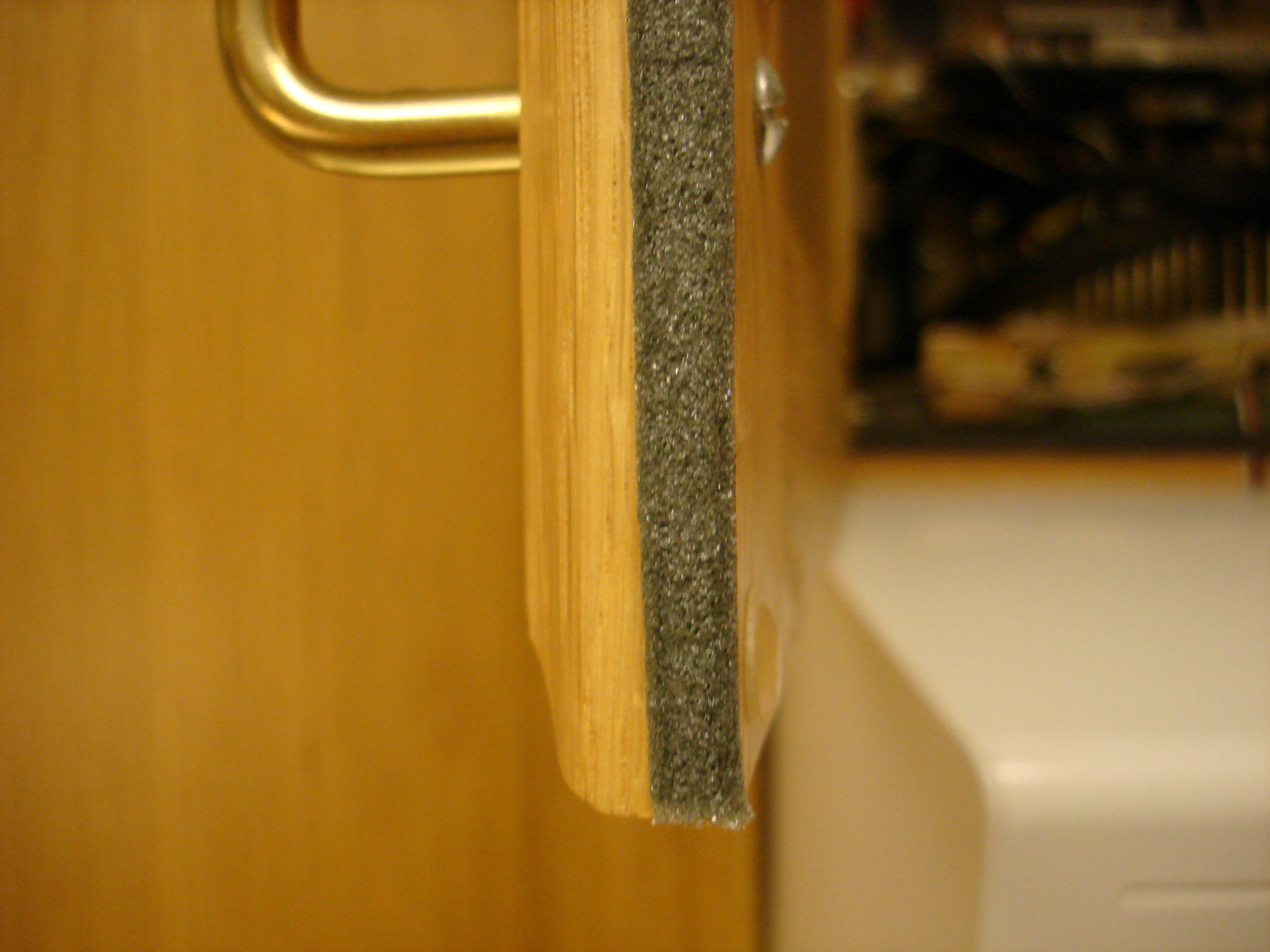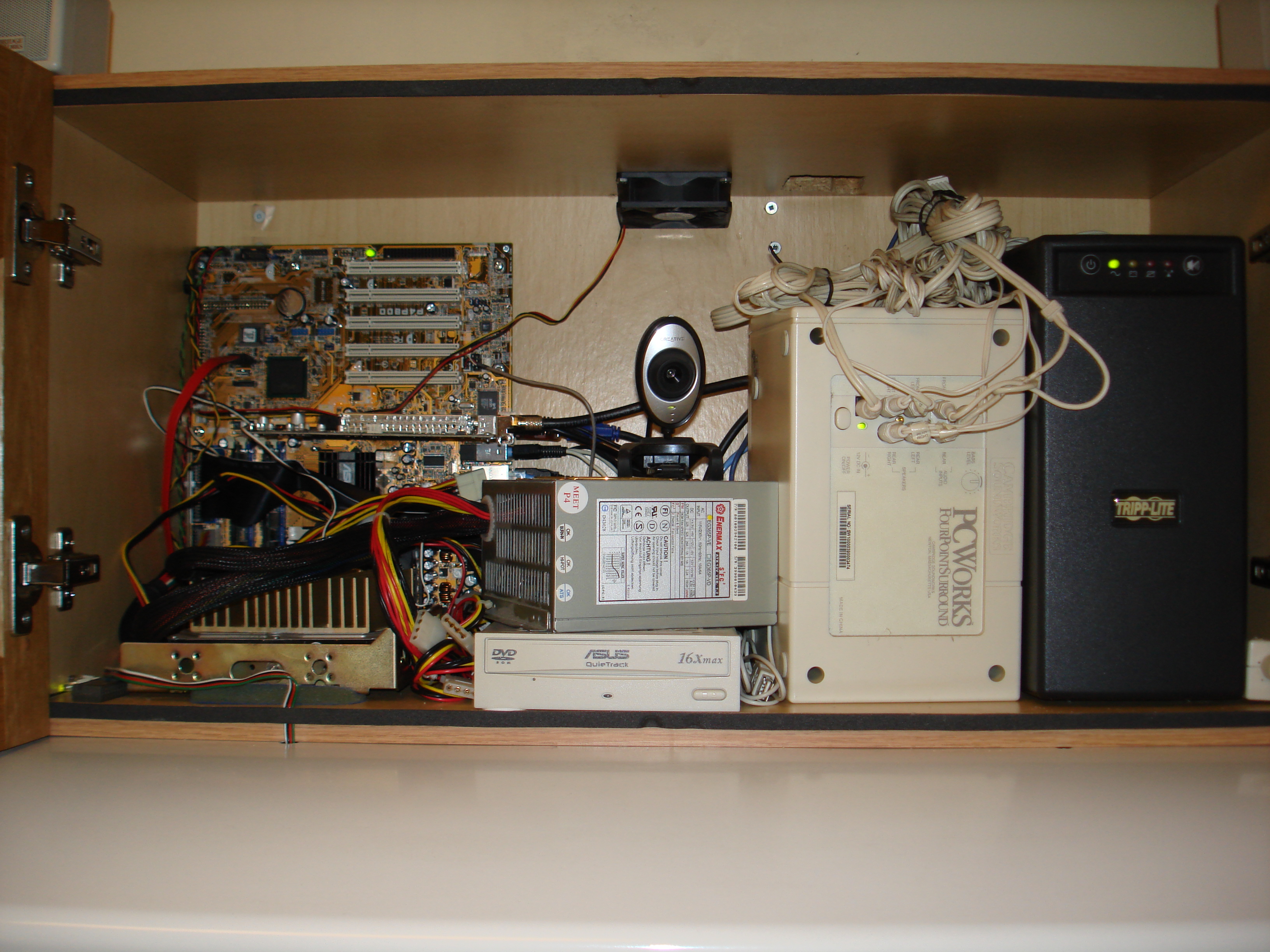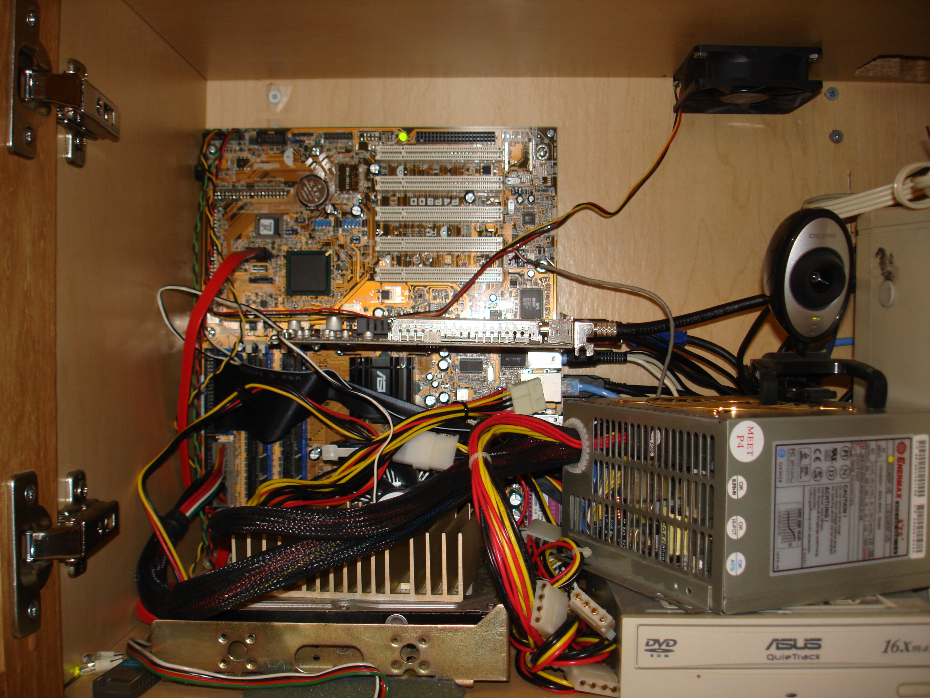 With the death of the second motherboard used for this system (an ASUS A7N8X-Deluxe which served very nicely for many years) we decided that we needed to add some better air filtration to the system. The problem was that the greasy kitchen air was being sucked into the cabinet by the exhaust fan we had cut into the top of the cabinet (needed to keep the system from overheating). By sealing off around the cupboard doors with some foam tape from our local Home Depot we made the cabinet more or less air tight. Adding a second cuttout in the top of the cabinet with a filter (a piece of a green scrubbing pad for doing dishes cut to size) made a new source for cool air which won't let all that grease into the cupboard.
