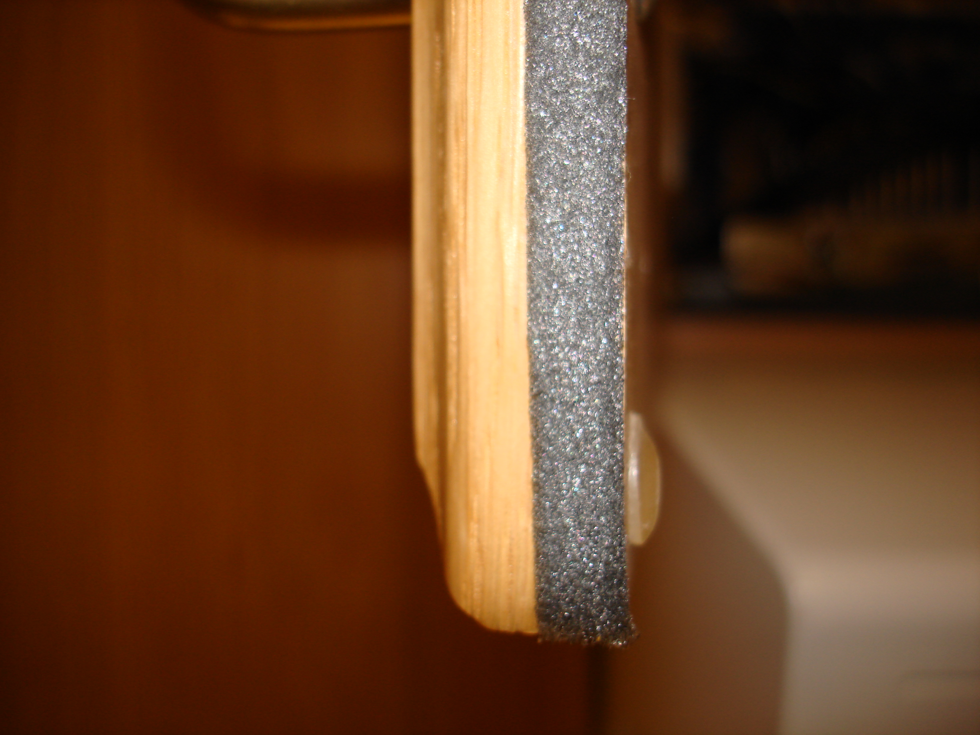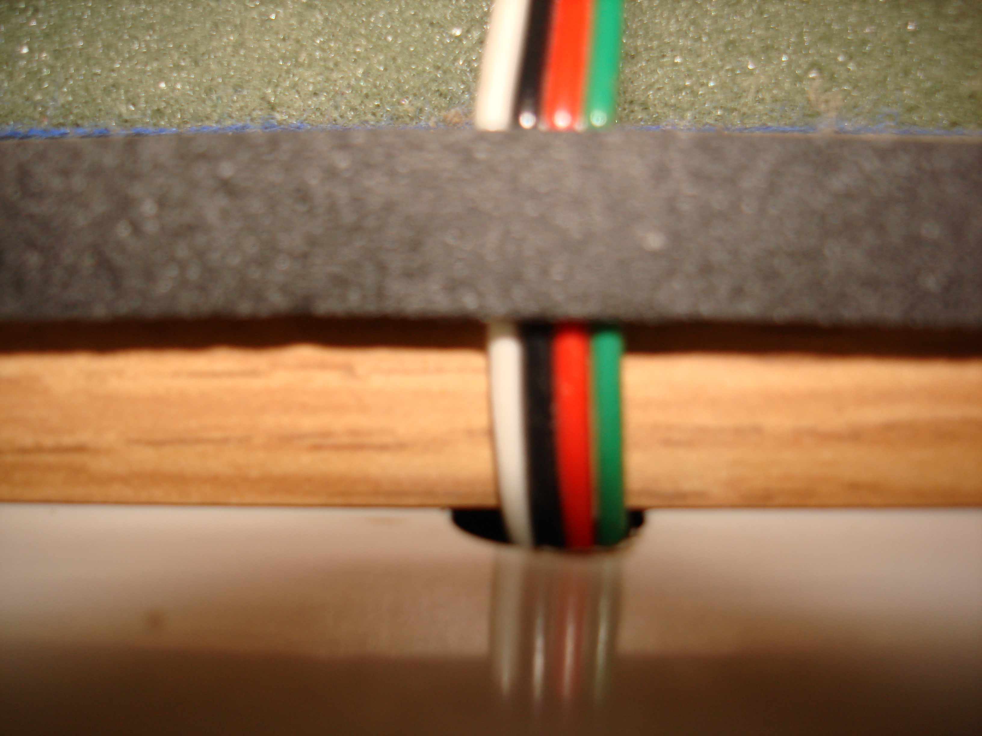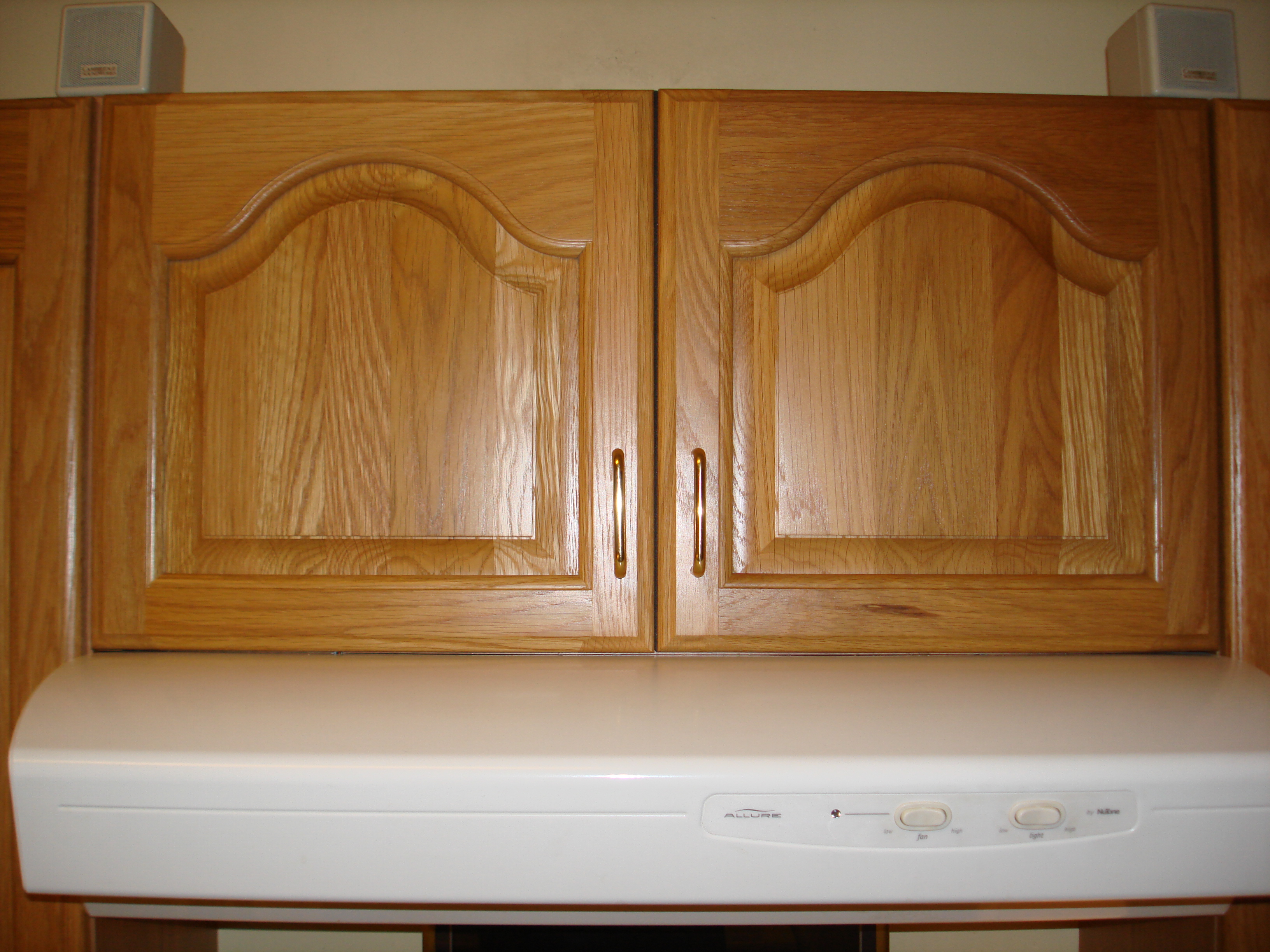 With the death of the second motherboard used for this system (an ASUS A7N8X-Deluxe which served very nicely for many years) we decided that we needed to add some better air filtration to the system. The problem was that the greasy kitchen air was being sucked into the cabinet by the exhaust fan we had cut into the top of the cabinet (needed to keep the system from overheating). By sealing off around the cupboard doors with some foam tape from our local Home Depot we made the cabinet more or less air tight. Adding a second cuttout in the top of the cabinet with a filter (a piece of a green scrubbing pad for doing dishes cut to size) made a new source for cool air which won't let all that grease into the cupboard.